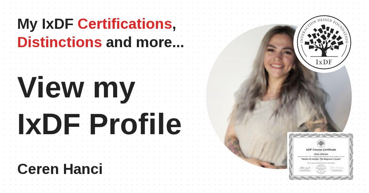 IxDF Course Certificates are awarded to Ceren Hanci in formal recognition of their coursework surpassing the rigorous benchmarks of exceptional performance established by the IxDF Educational Codex.