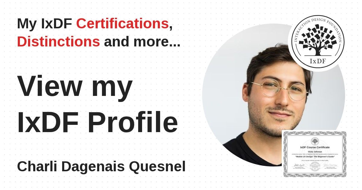 IxDF Course Certificates are awarded to Charli Dagenais Quesnel in formal recognition of their coursework surpassing the rigorous benchmarks of exceptional performance established by the IxDF Educational Codex.