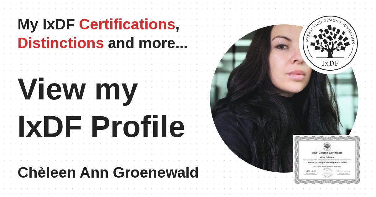 IxDF Course Certificates are awarded to Chèleen Ann Groenewald in formal recognition of their coursework surpassing the rigorous benchmarks of exceptional performance established by the IxDF Educational Codex.