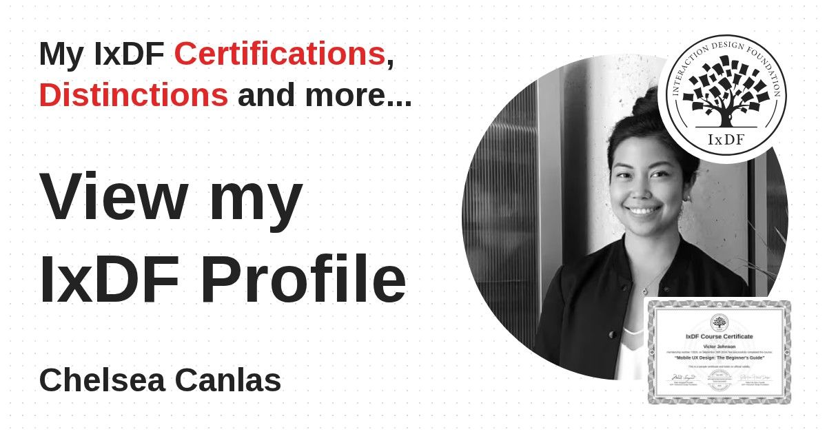 IxDF Course Certificates are awarded to Chelsea Canlas in formal recognition of their coursework surpassing the rigorous benchmarks of exceptional performance established by the IxDF Educational Codex.