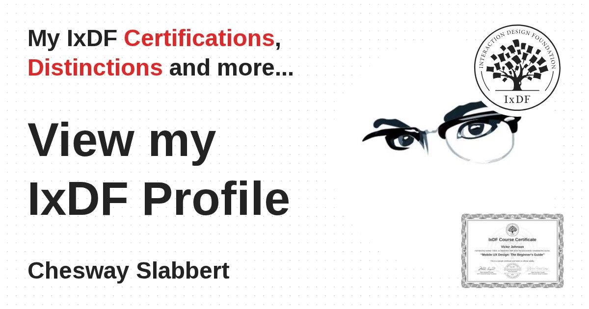 IxDF Course Certificates are awarded to Chesway Slabbert in formal recognition of their coursework surpassing the rigorous benchmarks of exceptional performance established by the IxDF Educational Codex.