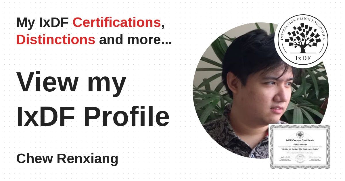 IxDF Course Certificates are awarded to Chew Renxiang in formal recognition of their coursework surpassing the rigorous benchmarks of exceptional performance established by the IxDF Educational Codex.