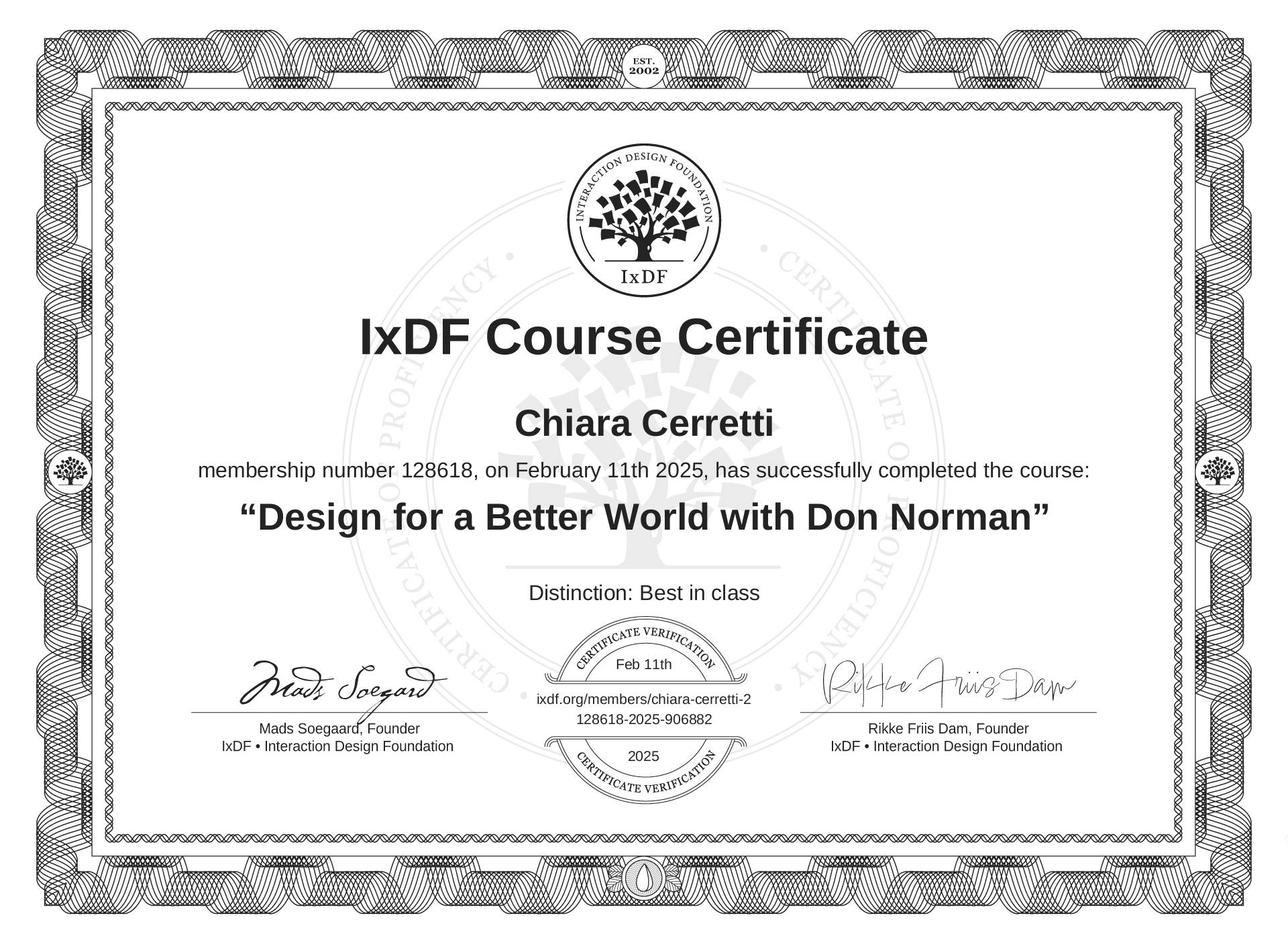 This IxDF Membership Certificate is issued to Chiara Cerretti