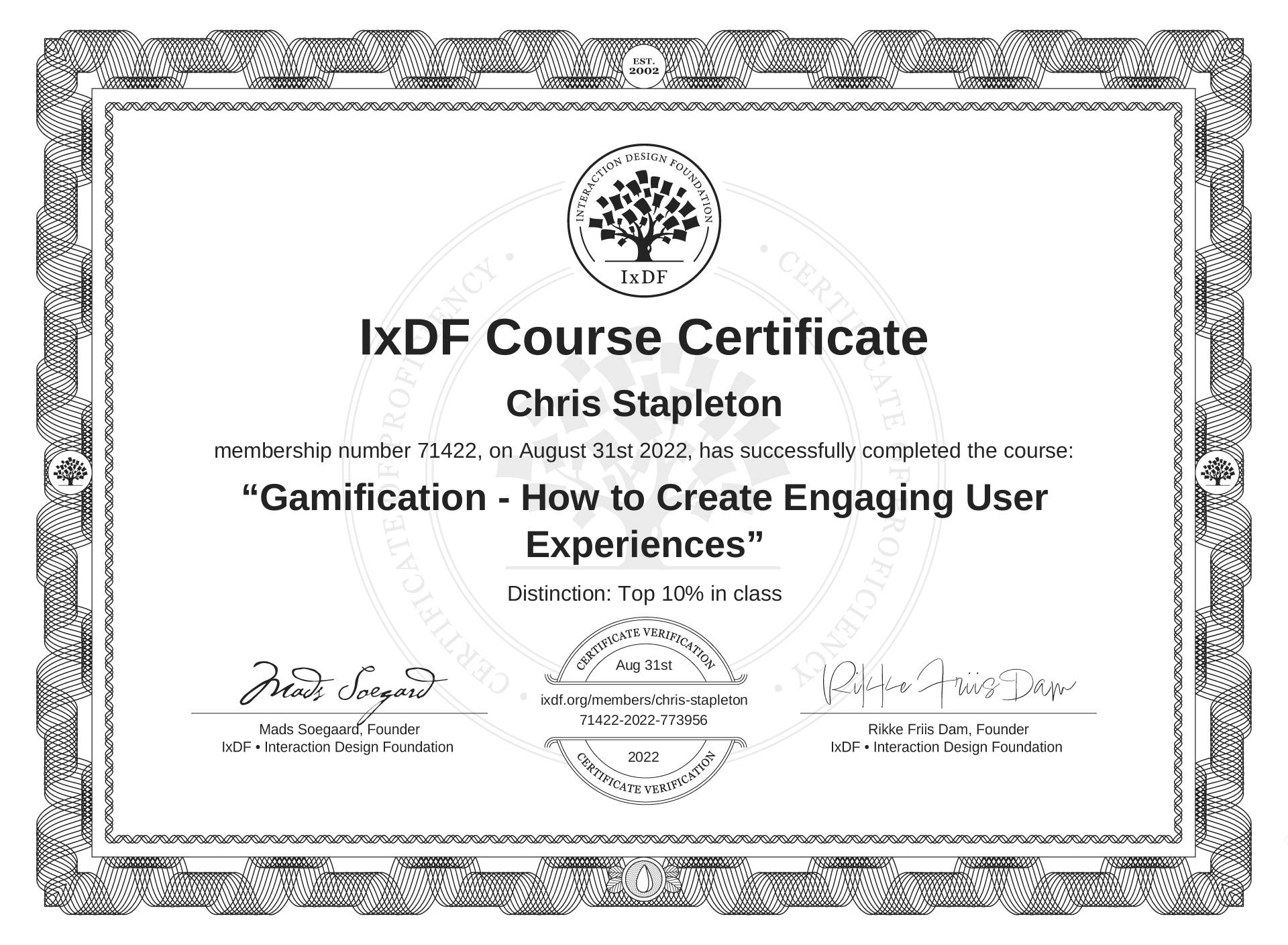 The IxDF Course Certificate (ID #4d6733b7-92c1-4eb0-9df7-f909d976cfd2) above is awarded to Chris Stapleton