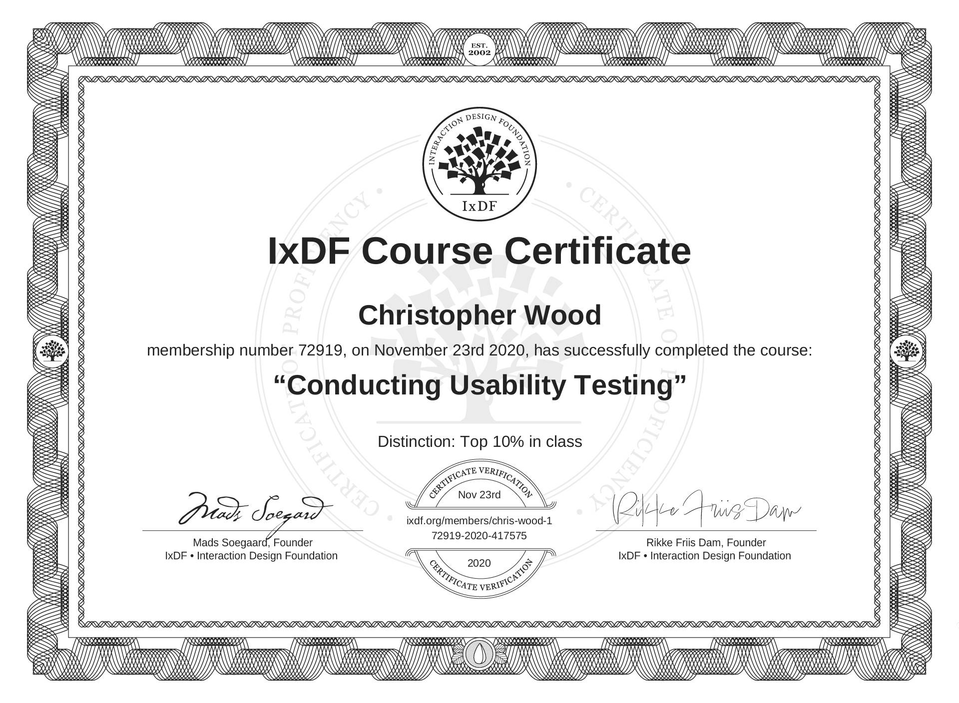 IxDF Course Certificates are awarded to Christopher Wood in formal recognition of their coursework surpassing the rigorous benchmarks of exceptional performance established by the IxDF Educational Codex.