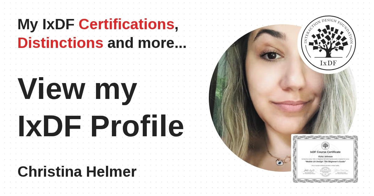 IxDF Course Certificates are awarded to Christina Helmer in formal recognition of their coursework surpassing the rigorous benchmarks of exceptional performance established by the IxDF Educational Codex.