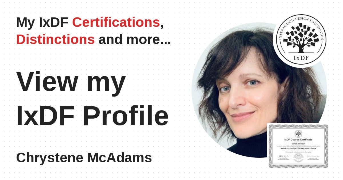 IxDF Course Certificates are awarded to Chrystene McAdams in formal recognition of their coursework surpassing the rigorous benchmarks of exceptional performance established by the IxDF Educational Codex.
