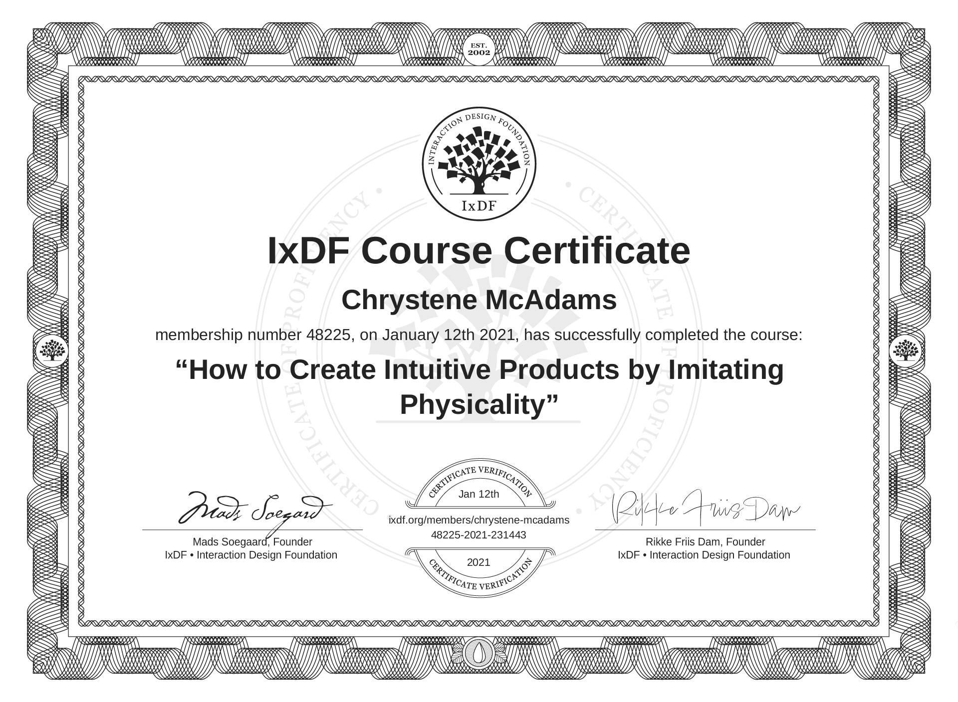 Chrystene McAdams's Course Certificate: How to Create Intuitive Products by Imitating Physicality