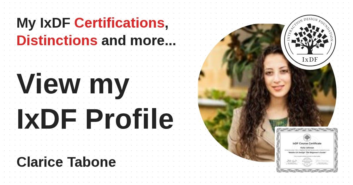 IxDF Course Certificates are awarded to Clarice Tabone in formal recognition of their coursework surpassing the rigorous benchmarks of exceptional performance established by the IxDF Educational Codex.