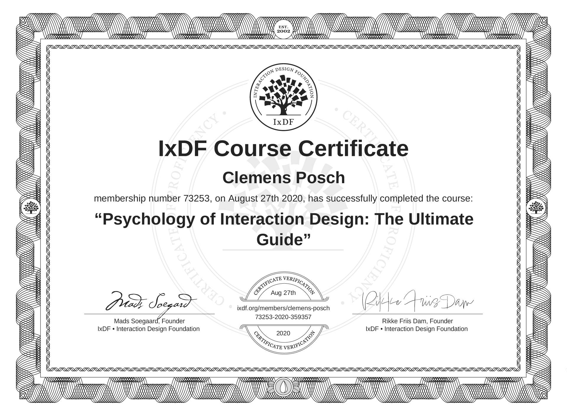 IxDF Course Certificate awarded to Clemens Posch for completing the "Psychology of Interaction Design: The Ultimate Guide" course