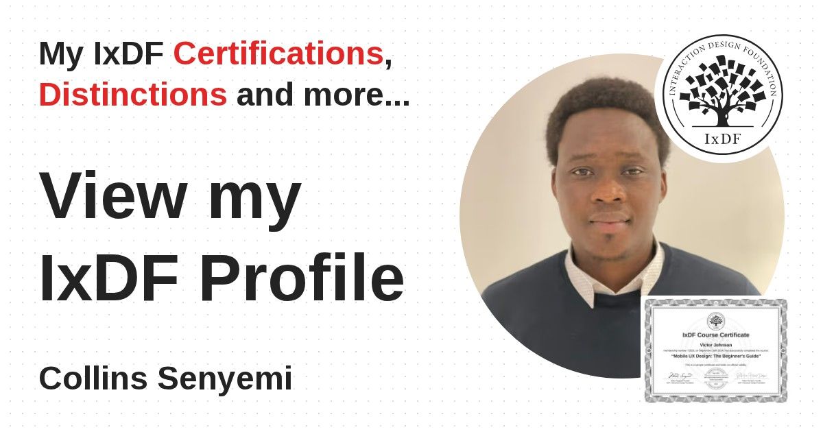 IxDF Course Certificates are awarded to Collins Senyemi in formal recognition of their coursework surpassing the rigorous benchmarks of exceptional performance established by the IxDF Educational Codex.