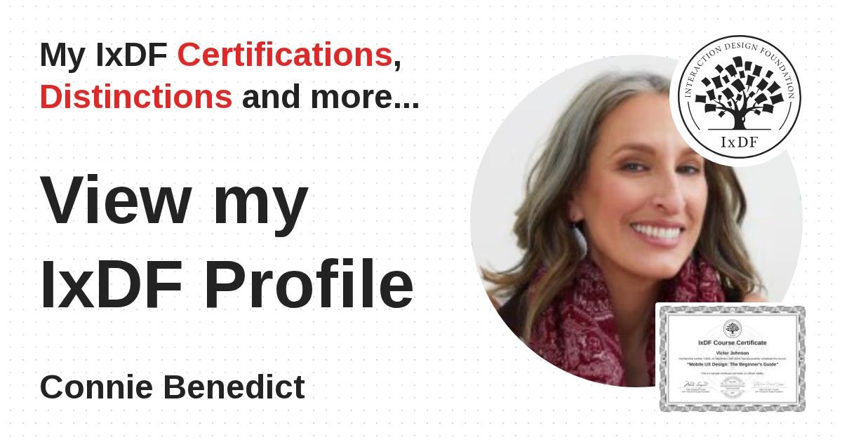 Distinctions are conferred upon Connie Benedict in formal recognition of their notable achievements and contributions, as stipulated by the IxDF Educational Codex.