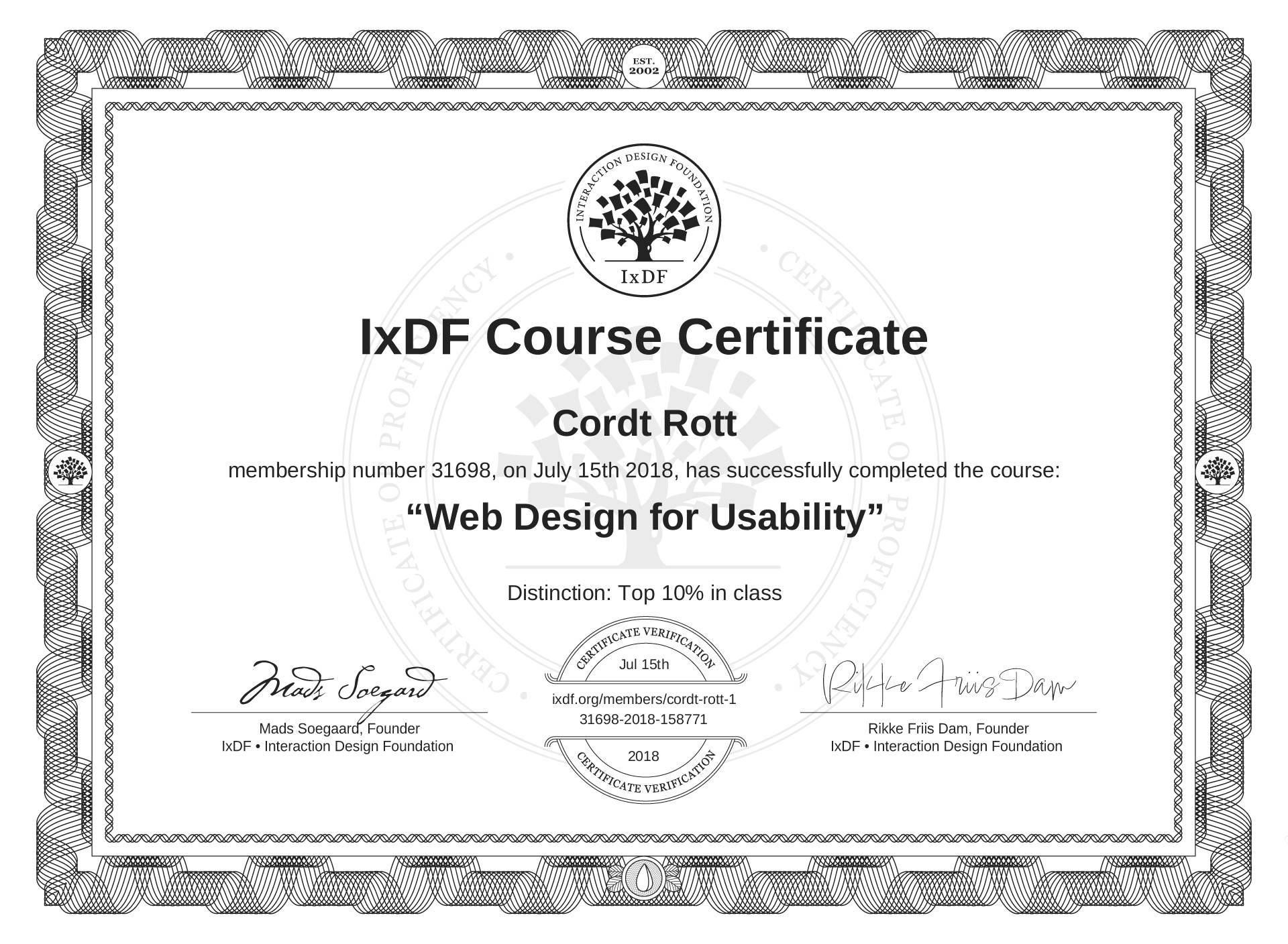 The IxDF Course Certificate (ID #P5KpDMJj7) above is awarded to Cordt Rott with a Top 10% Distinction in formal recognition of their coursework surpassing the rigorous benchmarks of exceptional performance established by the IxDF Educational Codex. View Course Curriculum.