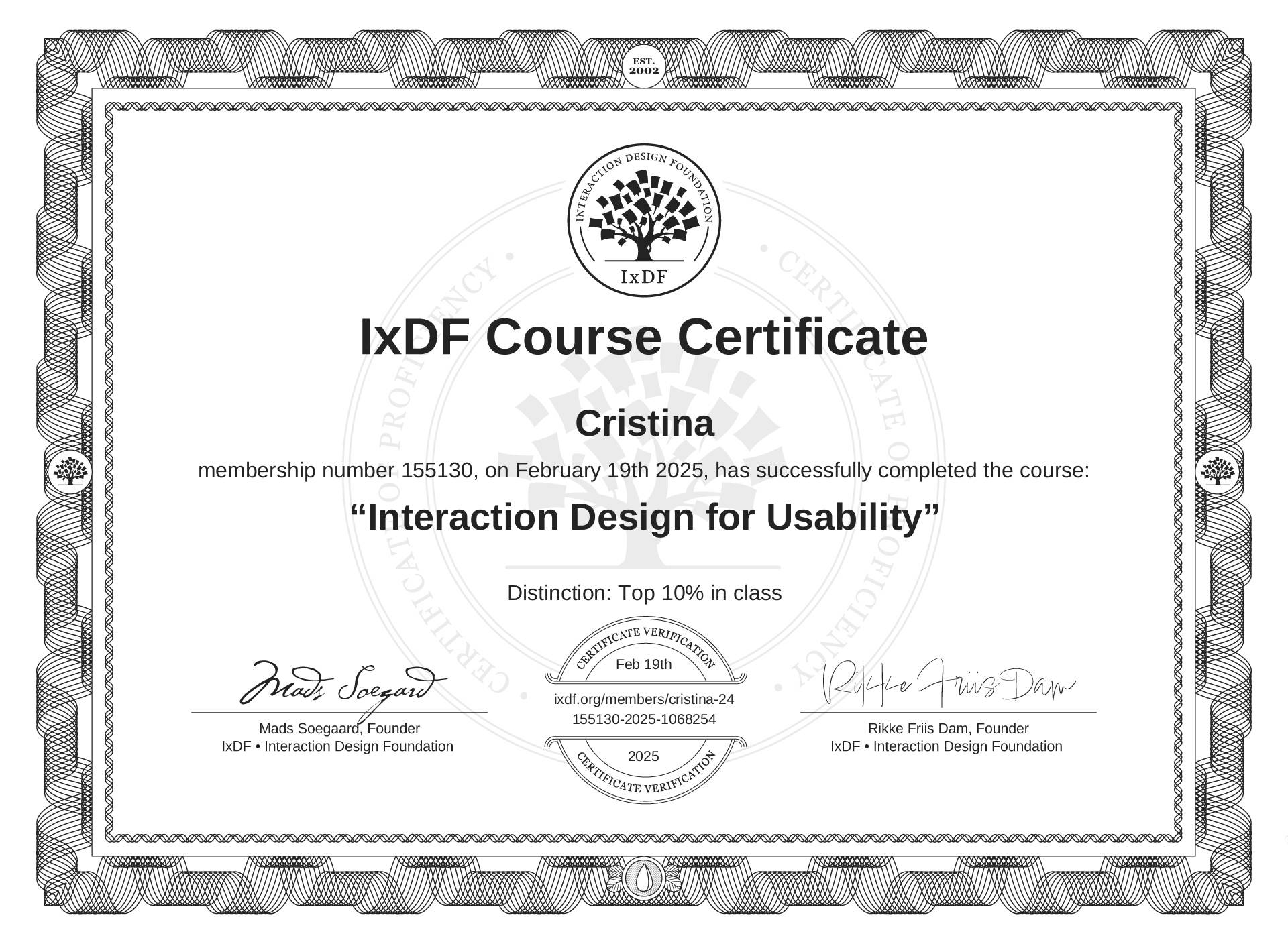 The IxDF Course Certificate (ID #afd38b18-7e7e-4ed5-86ec-262f7e57cd7b) above is awarded to Cristina