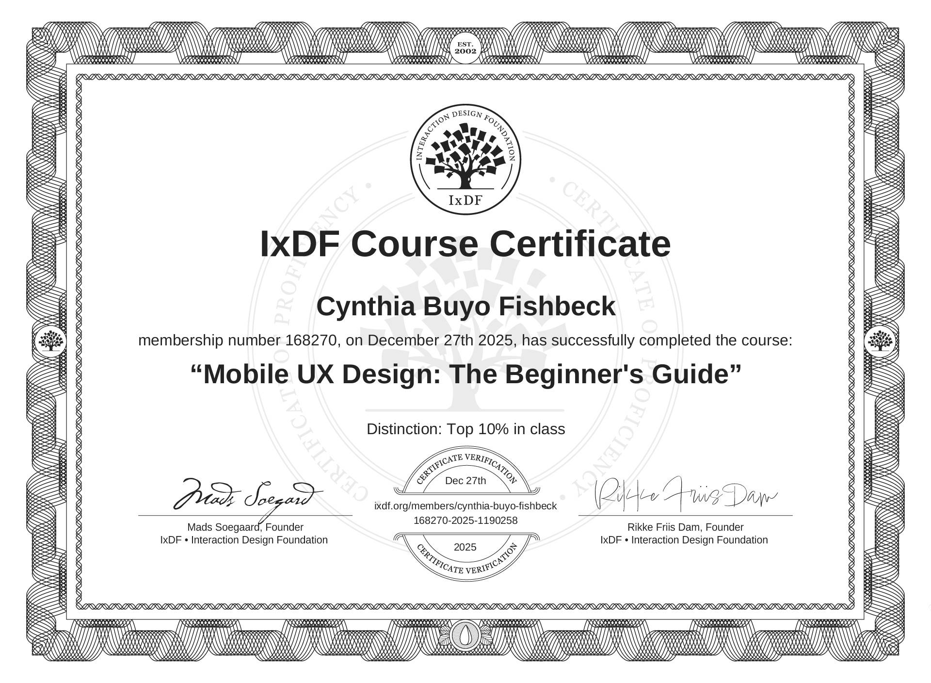 IxDF Course Certificates are awarded to Cynthia Buyo Fishbeck in formal recognition of their coursework surpassing the rigorous benchmarks of exceptional performance established by the IxDF Educational Codex.
