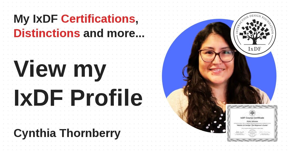 IxDF Course Certificates are awarded to Cynthia Thornberry in formal recognition of their coursework surpassing the rigorous benchmarks of exceptional performance established by the IxDF Educational Codex.