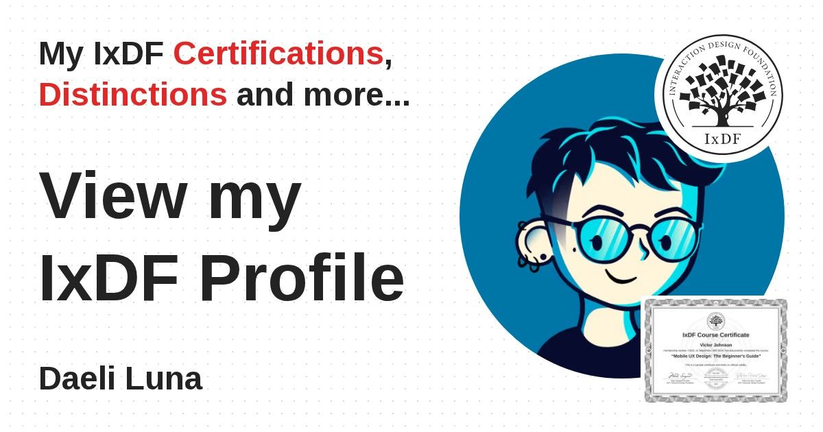 IxDF Course Certificates are awarded to Daeli Luna in formal recognition of their coursework surpassing the rigorous benchmarks of exceptional performance established by the IxDF Educational Codex.
