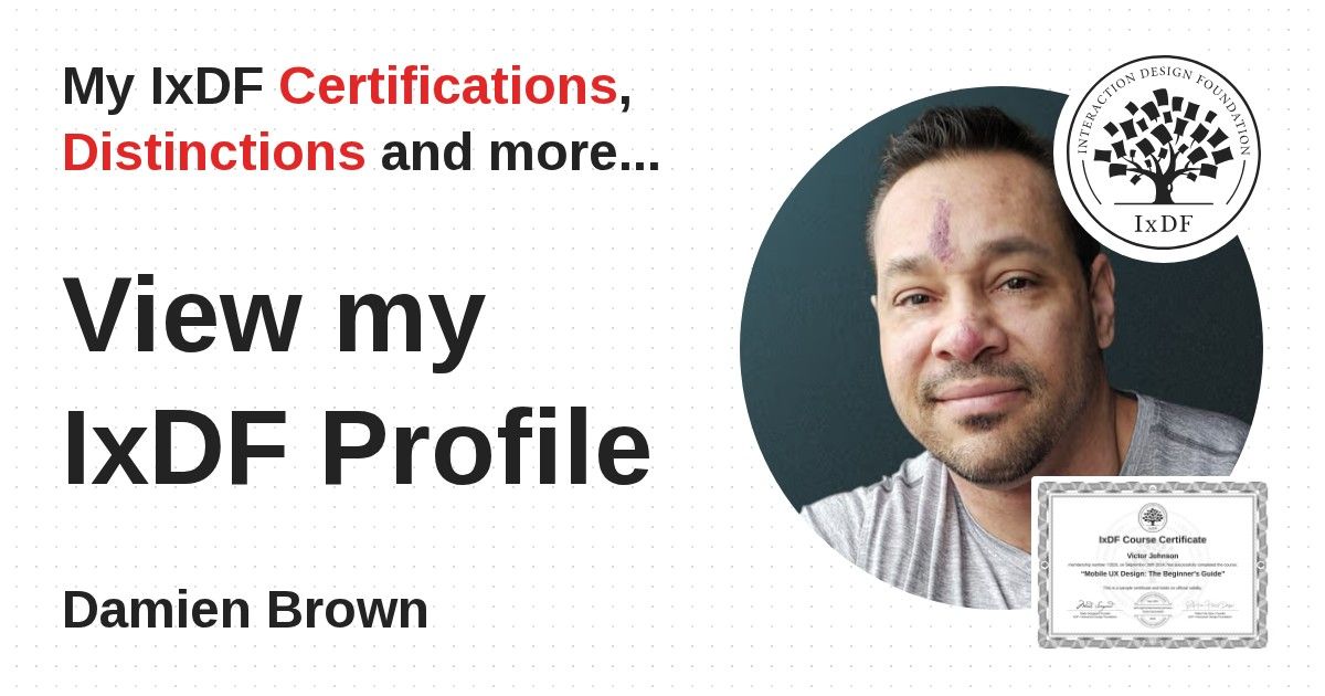 IxDF Course Certificates are awarded to Damien Brown in formal recognition of their coursework surpassing the rigorous benchmarks of exceptional performance established by the IxDF Educational Codex.