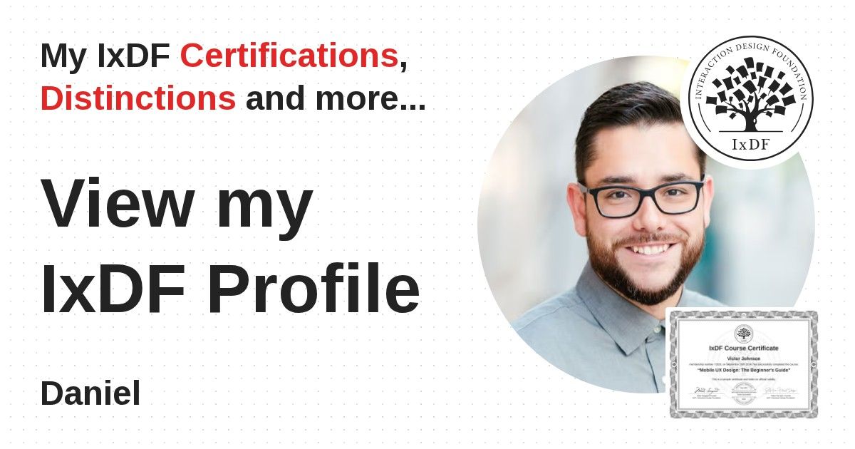 IxDF Course Certificates are awarded to Daniel in formal recognition of their coursework surpassing the rigorous benchmarks of exceptional performance established by the IxDF Educational Codex.