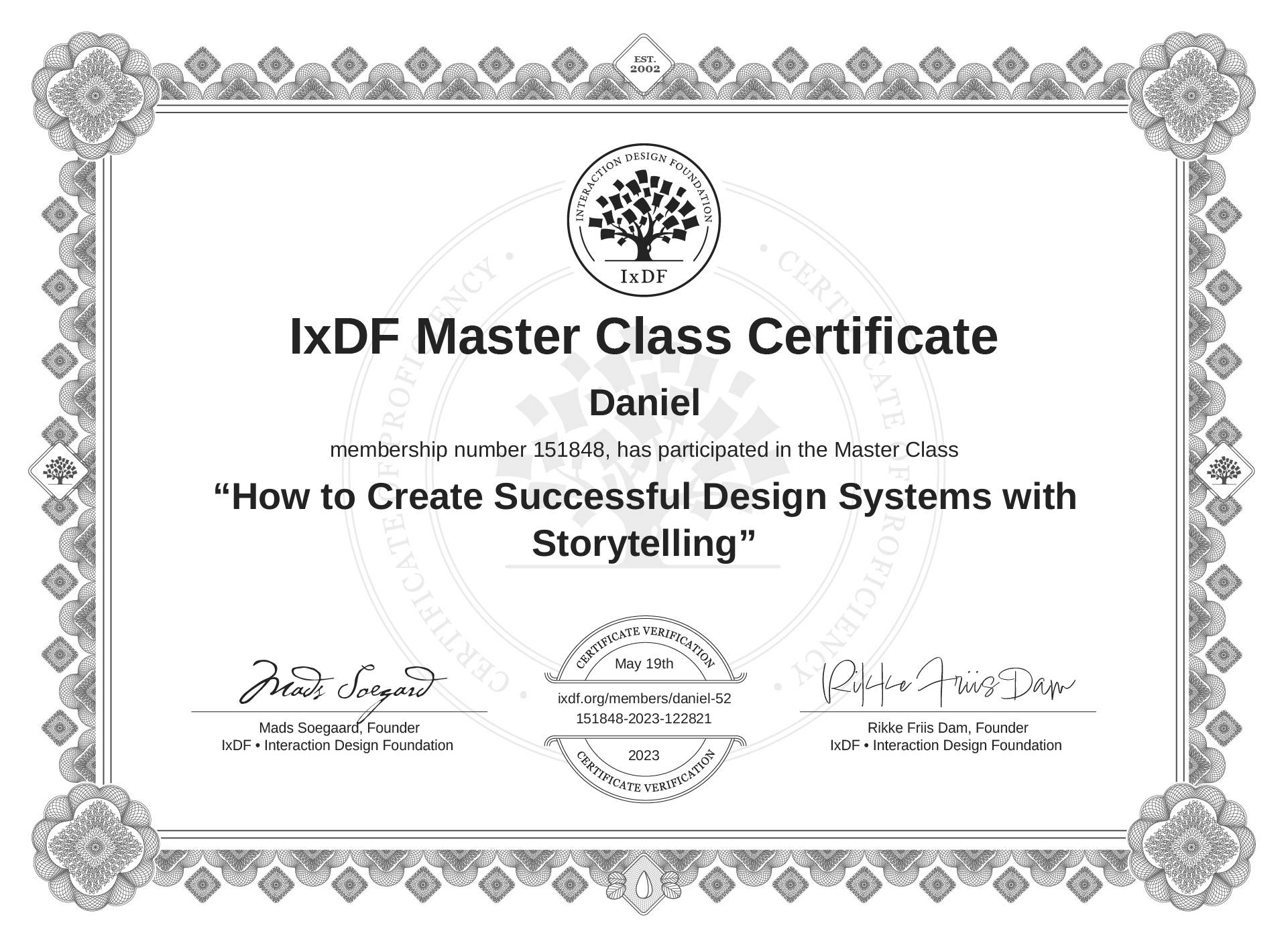 The IxDF Master Class Certificate (ID #mcc_46965921d1bb4ff68fff59e7642170a9) above is awarded to Daniel in formal recognition of their participation in the Master Class How to Create Successful Design Systems with Storytelling .