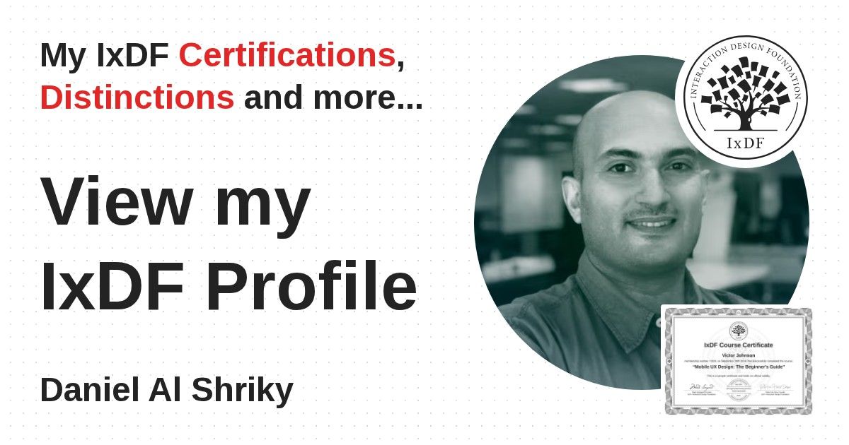 IxDF Course Certificates are awarded to Daniel Al Shriky in formal recognition of their coursework surpassing the rigorous benchmarks of exceptional performance established by the IxDF Educational Codex.