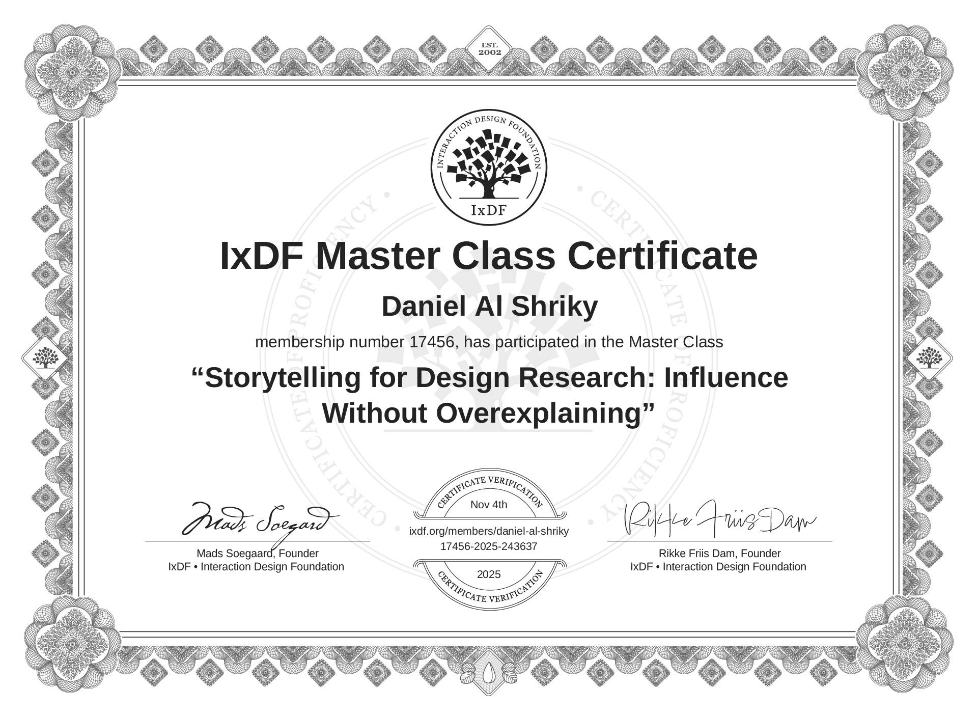 The IxDF Master Class Certificate (ID #mcc_af17c0870fc745198b8307eecf994e35) above is awarded to Daniel Al Shriky in formal recognition of their participation in the Master Class Storytelling for Design Research: Influence Without Overexplaining .
