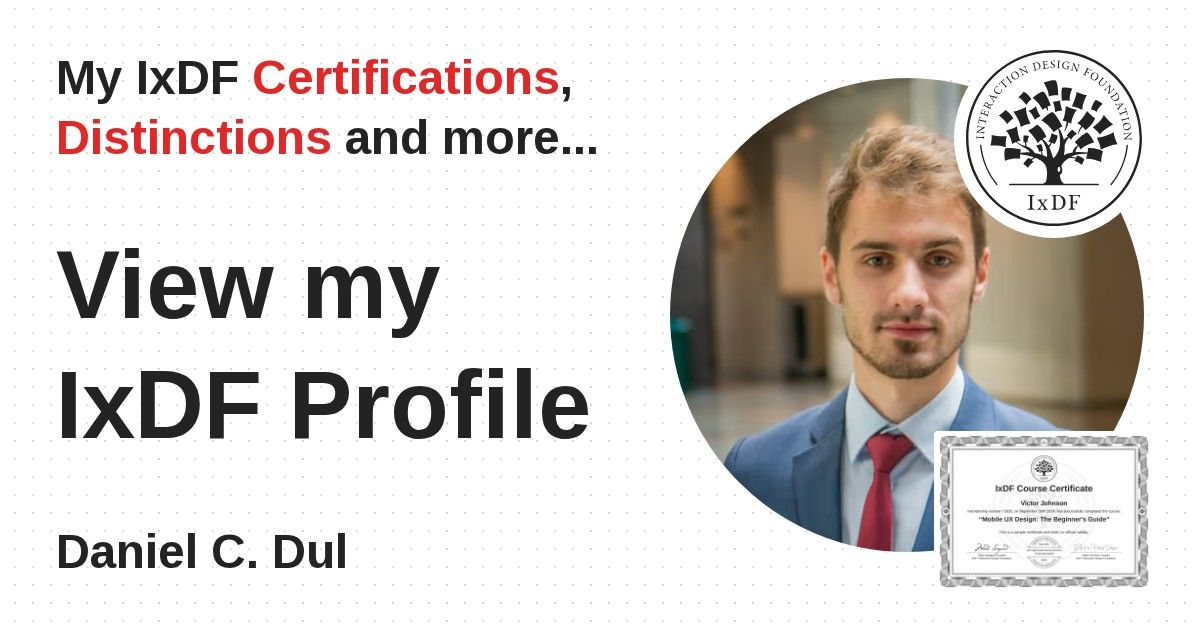 IxDF Course Certificates are awarded to Daniel C. Dul in formal recognition of their coursework surpassing the rigorous benchmarks of exceptional performance established by the IxDF Educational Codex.