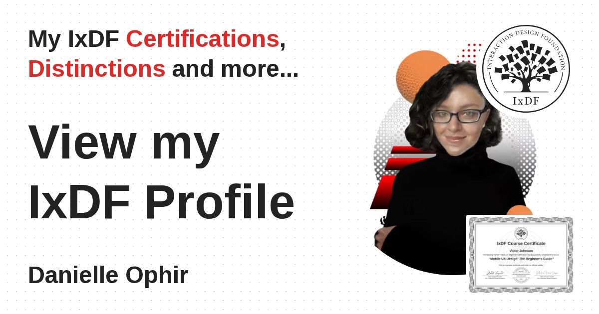 IxDF Course Certificates are awarded to Danielle Ophir in formal recognition of their coursework surpassing the rigorous benchmarks of exceptional performance established by the IxDF Educational Codex.