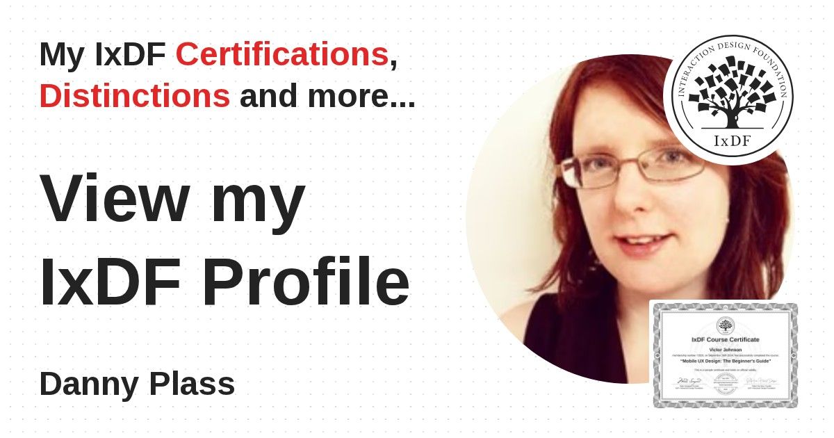 IxDF Course Certificates are awarded to Danny Plass in formal recognition of their coursework surpassing the rigorous benchmarks of exceptional performance established by the IxDF Educational Codex.