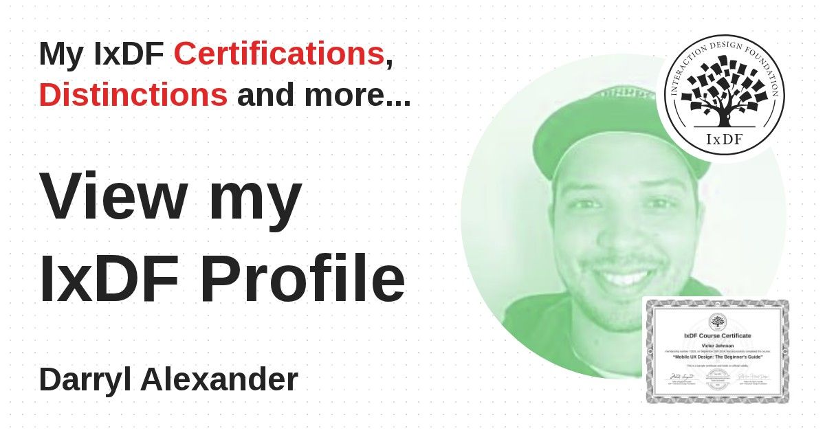 IxDF Course Certificates are awarded to Darryl Alexander in formal recognition of their coursework surpassing the rigorous benchmarks of exceptional performance established by the IxDF Educational Codex.