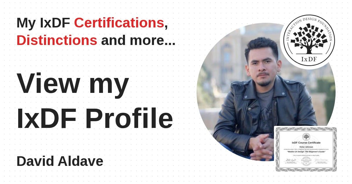 IxDF Course Certificates are awarded to David Aldave in formal recognition of their coursework surpassing the rigorous benchmarks of exceptional performance established by the IxDF Educational Codex.