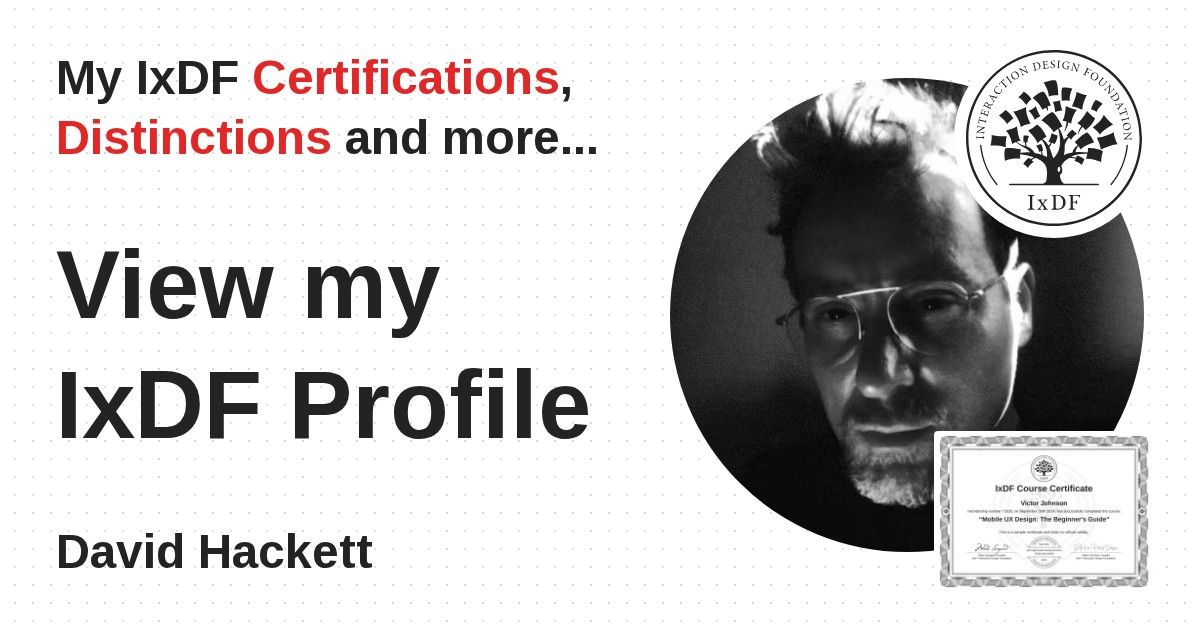 IxDF Course Certificates are awarded to David Hackett in formal recognition of their coursework surpassing the rigorous benchmarks of exceptional performance established by the IxDF Educational Codex.
