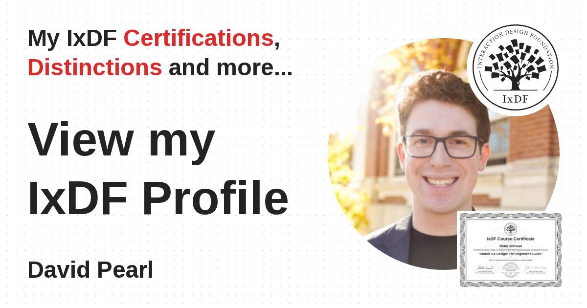 IxDF Course Certificates are awarded to David Pearl in formal recognition of their coursework surpassing the rigorous benchmarks of exceptional performance established by the IxDF Educational Codex.
