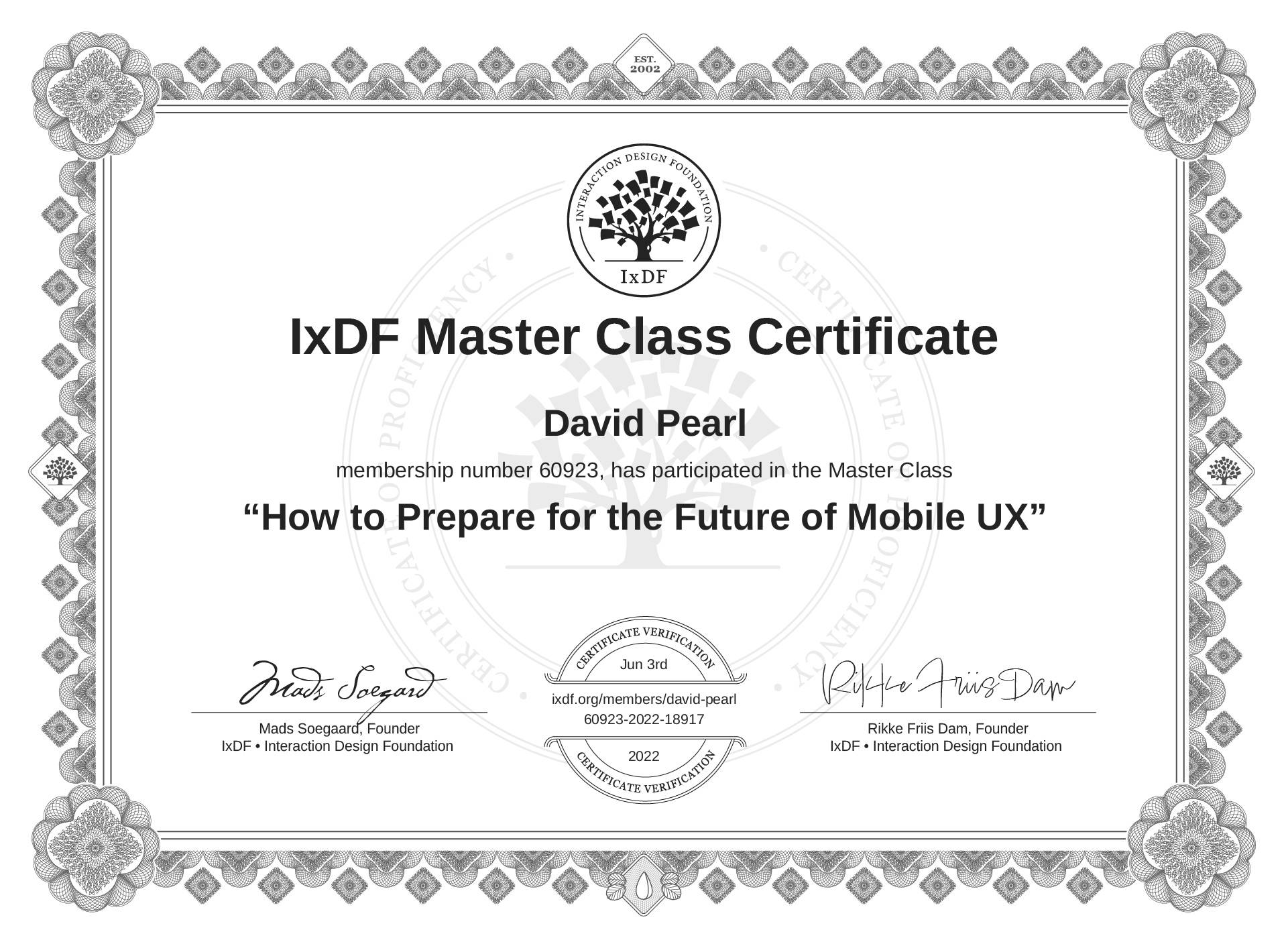 IxDF Master Class Certificates are awarded to David Pearl in formal recognition of their attendance and ongoing commitment to learning from industry leaders.