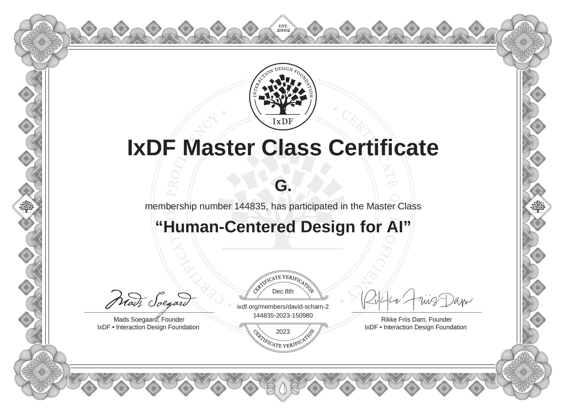 The IxDF Master Class Certificate (ID #mcc_33837457a44b4a75a16878e479264001) above is awarded to G. in formal recognition of their participation in the Master Class Human-Centered Design for AI .