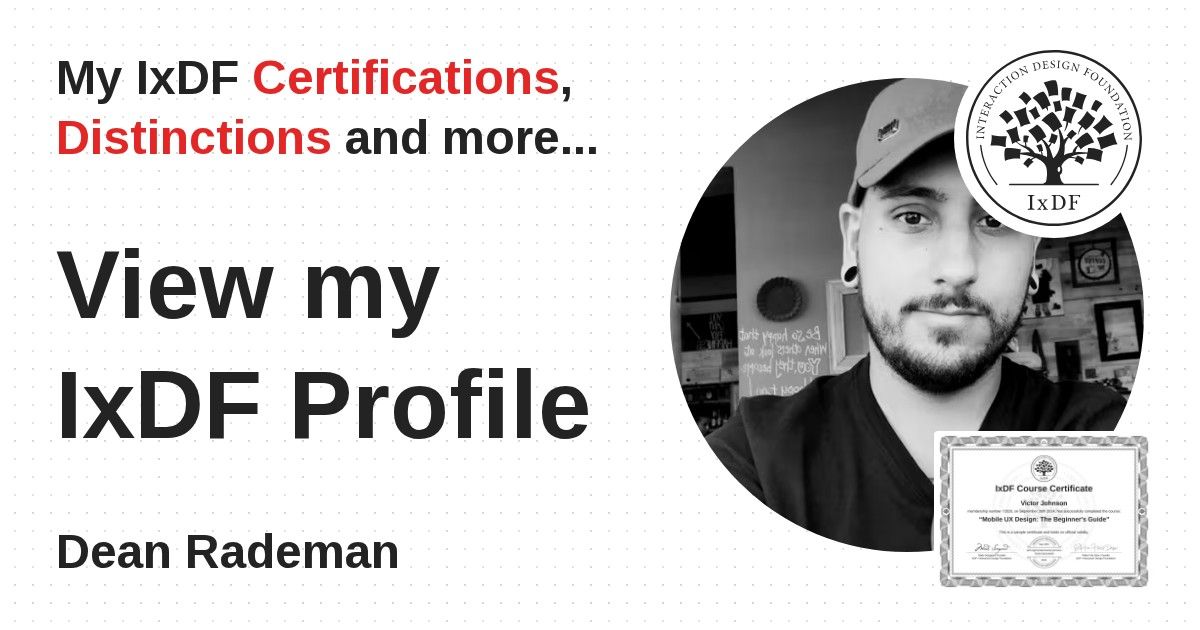IxDF Course Certificates are awarded to Dean Rademan in formal recognition of their coursework surpassing the rigorous benchmarks of exceptional performance established by the IxDF Educational Codex.