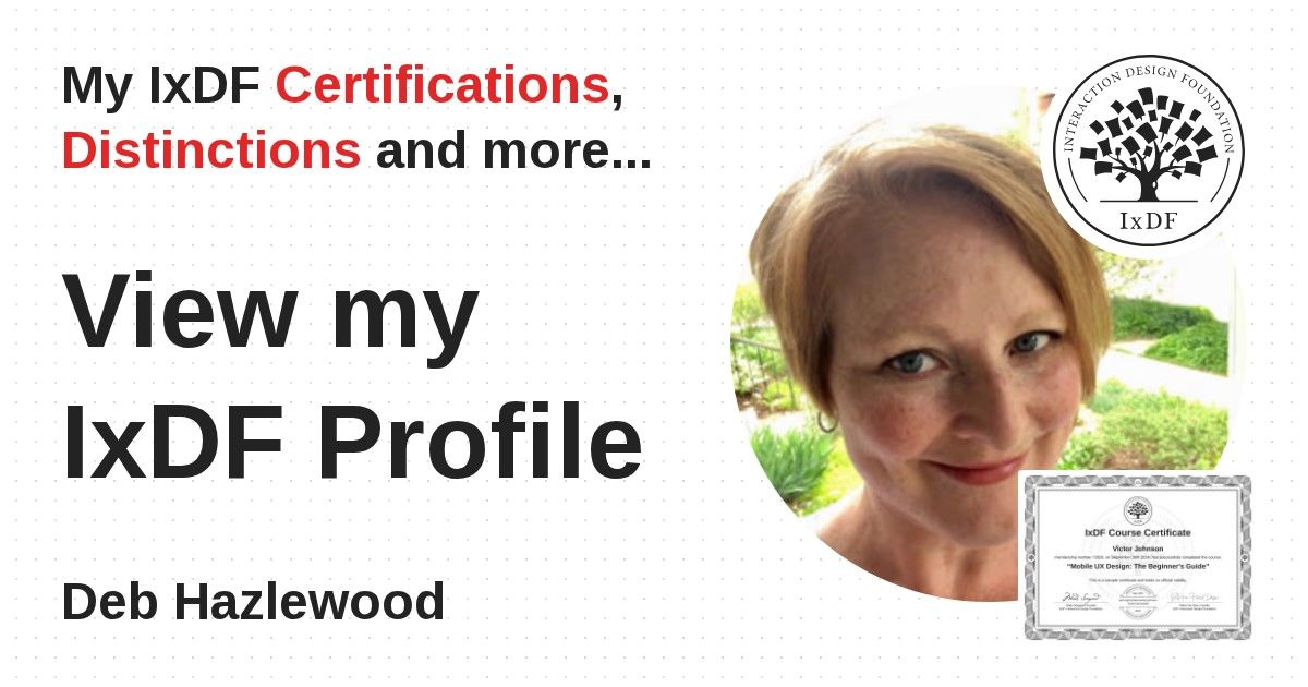 IxDF Course Certificates are awarded to Deb Hazlewood in formal recognition of their coursework surpassing the rigorous benchmarks of exceptional performance established by the IxDF Educational Codex.