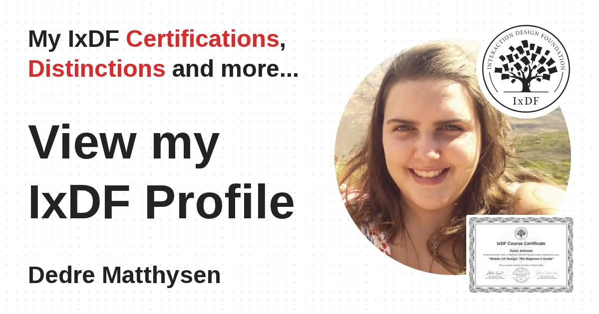 IxDF Course Certificates are awarded to Dedre Matthysen in formal recognition of their coursework surpassing the rigorous benchmarks of exceptional performance established by the IxDF Educational Codex.