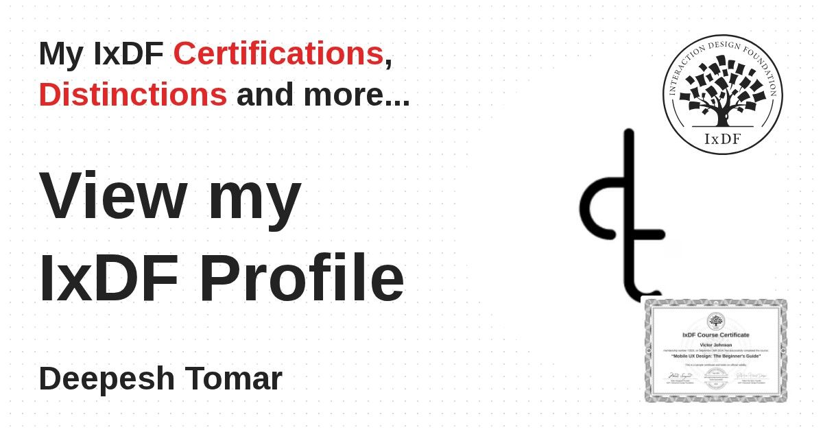 IxDF Course Certificates are awarded to Deepesh Tomar in formal recognition of their coursework surpassing the rigorous benchmarks of exceptional performance established by the IxDF Educational Codex.