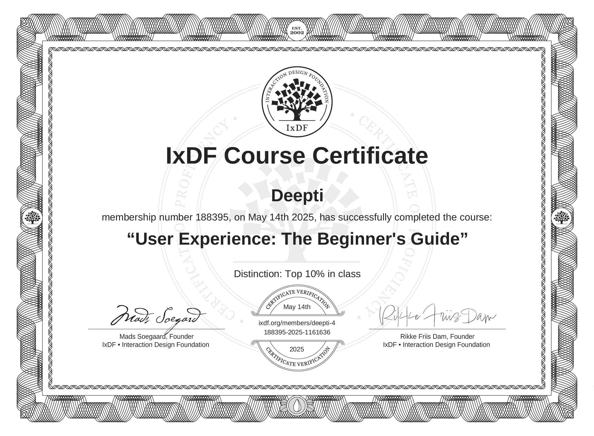The IxDF Course Certificate (ID #995eca61-b06e-4760-9c77-8630f569e4c0) above is awarded to Deepti