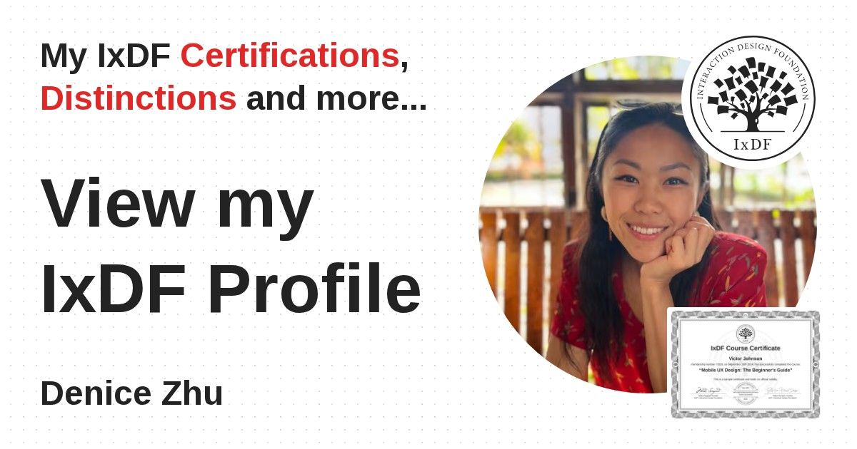 IxDF Course Certificates are awarded to Denice Zhu in formal recognition of their coursework surpassing the rigorous benchmarks of exceptional performance established by the IxDF Educational Codex.