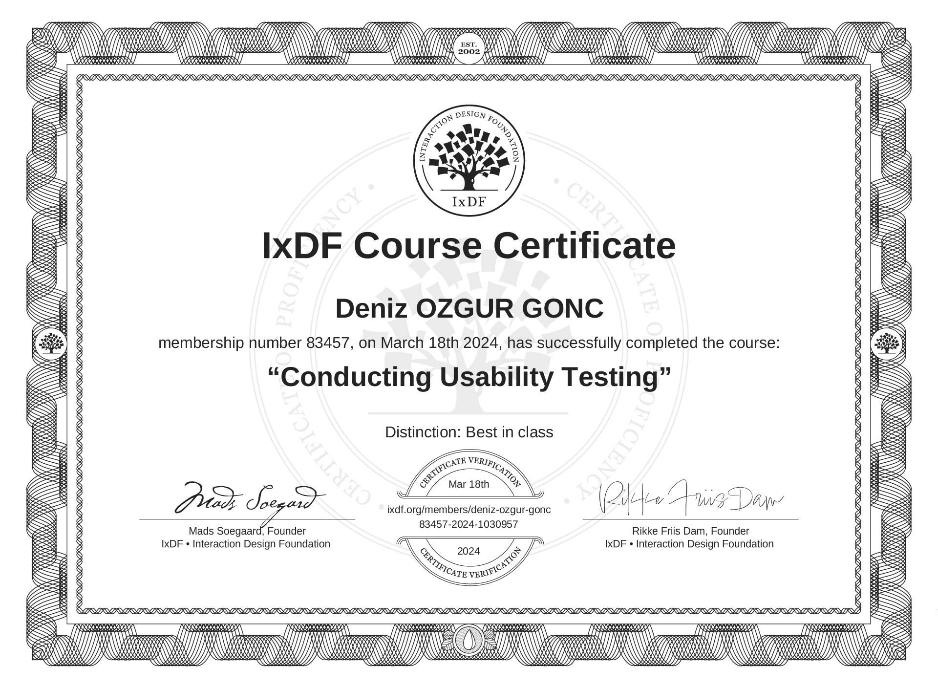 IxDF Course Certificates are awarded to Deniz OZGUR GONC in formal recognition of their coursework surpassing the rigorous benchmarks of exceptional performance established by the IxDF Educational Codex.