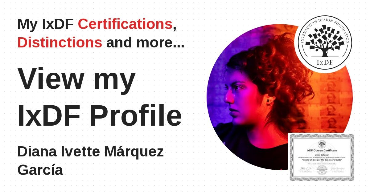 IxDF Course Certificates are awarded to Diana Ivette Márquez García in formal recognition of their coursework surpassing the rigorous benchmarks of exceptional performance established by the IxDF Educational Codex.