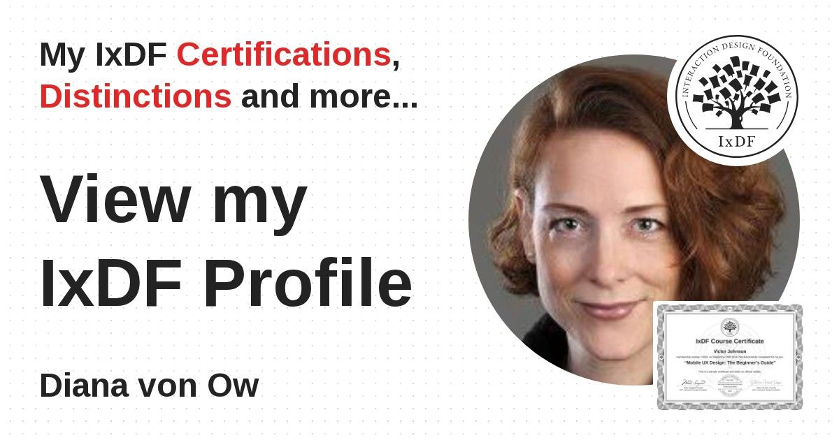 IxDF Course Certificates are awarded to Diana von Ow in formal recognition of their coursework surpassing the rigorous benchmarks of exceptional performance established by the IxDF Educational Codex.