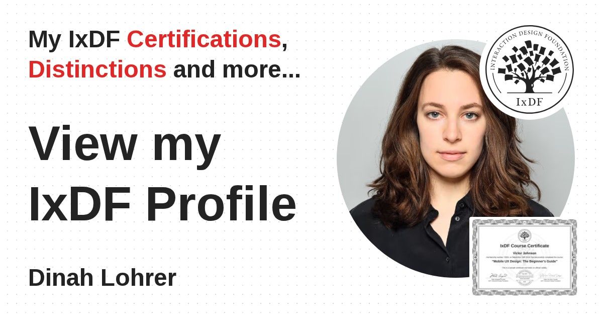 IxDF Course Certificates are awarded to Dinah Lohrer in formal recognition of their coursework surpassing the rigorous benchmarks of exceptional performance established by the IxDF Educational Codex.