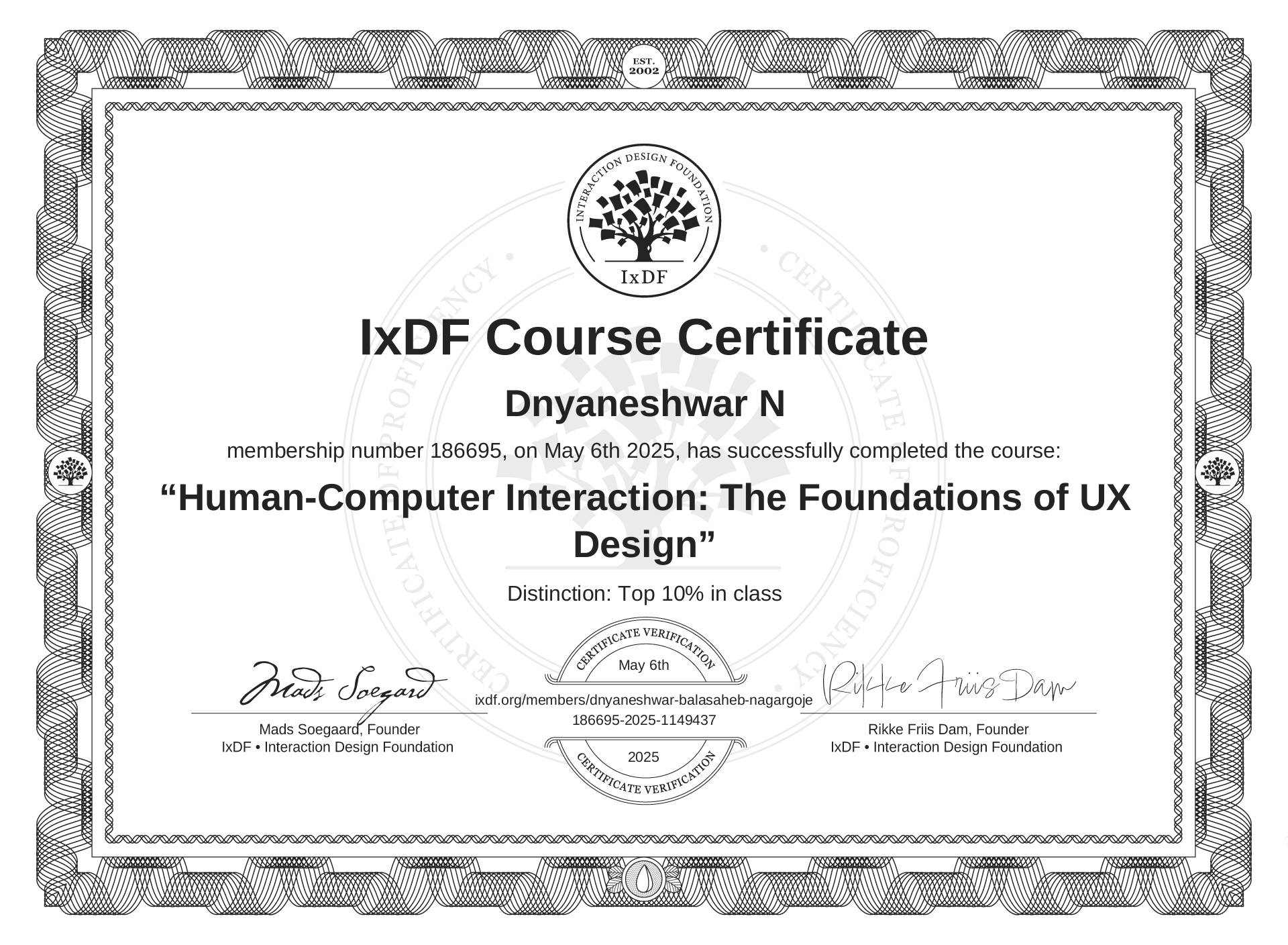 The IxDF Course Certificate (ID #c68af5cd-d434-41ca-8a68-000b32e2aca5) above is awarded to Dnyaneshwar N with a Top 10% Distinction in formal recognition of their coursework surpassing the rigorous benchmarks of exceptional performance established by the IxDF Educational Codex. View Course Curriculum.
