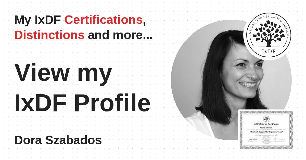 IxDF Course Certificates are awarded to Dora Szabados in formal recognition of their coursework surpassing the rigorous benchmarks of exceptional performance established by the IxDF Educational Codex.