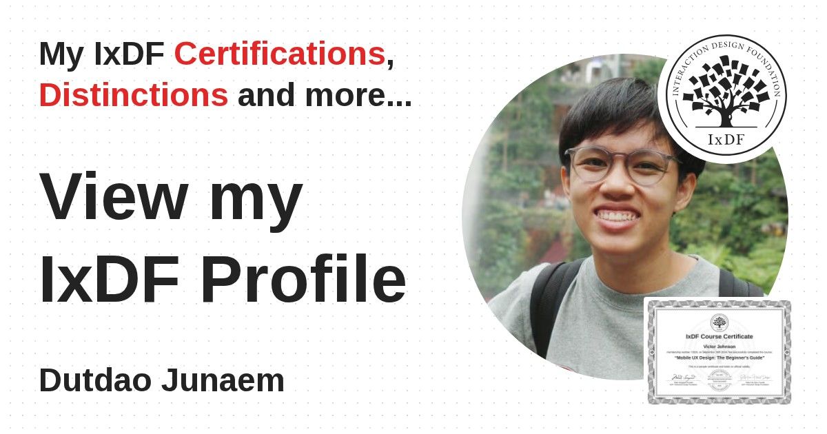 IxDF Course Certificates are awarded to Dutdao Junaem in formal recognition of their coursework surpassing the rigorous benchmarks of exceptional performance established by the IxDF Educational Codex.
