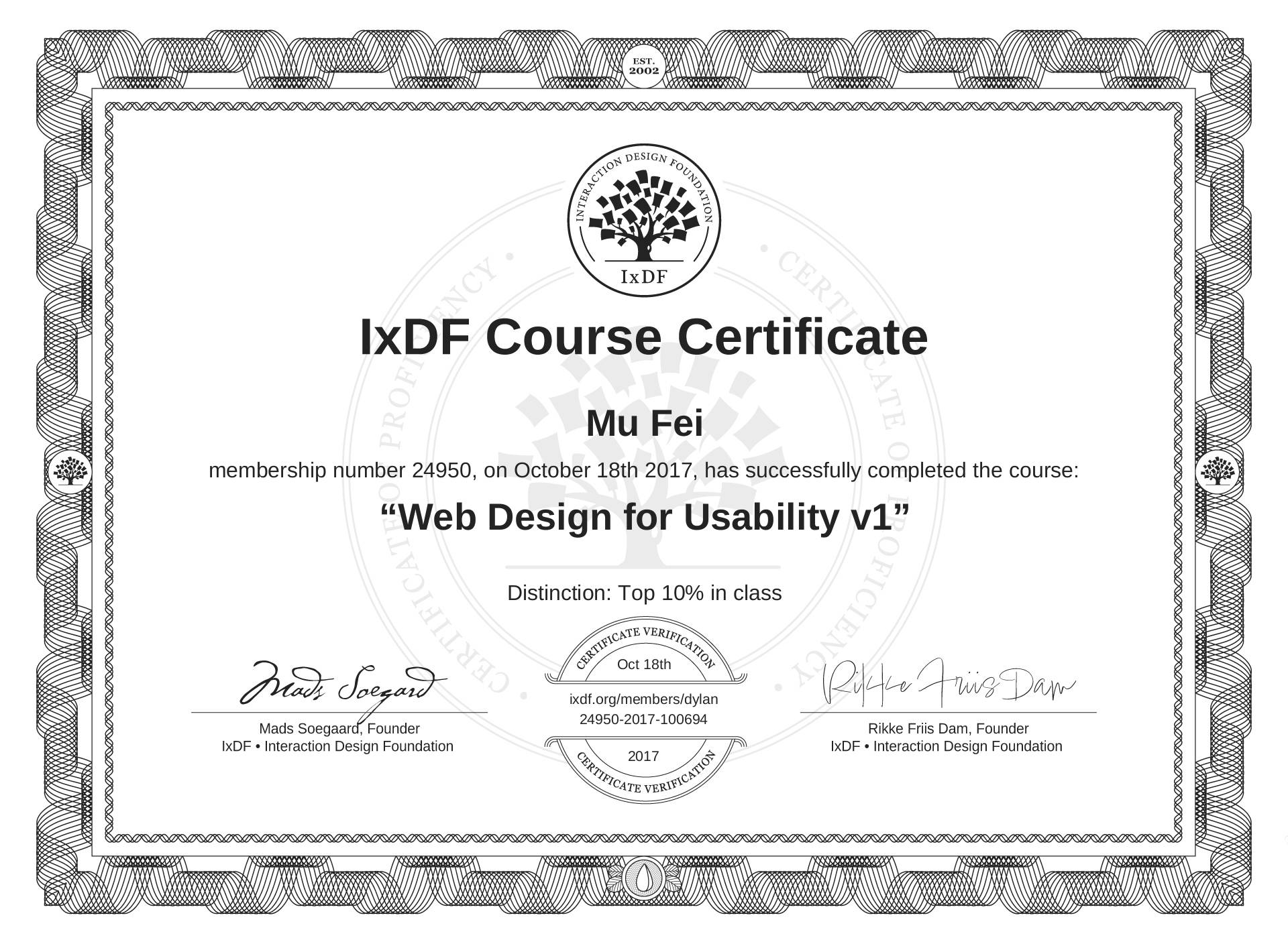 The IxDF Course Certificate (ID #NsmJcvXpb) above is awarded to Mu Fei