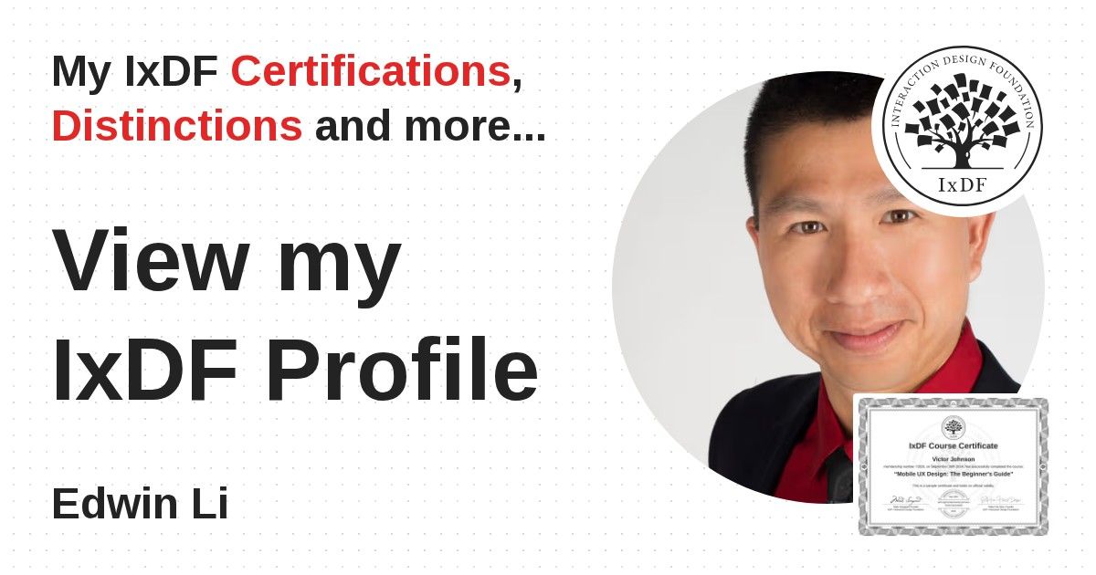 IxDF Course Certificates are awarded to Edwin Li in formal recognition of their coursework surpassing the rigorous benchmarks of exceptional performance established by the IxDF Educational Codex.